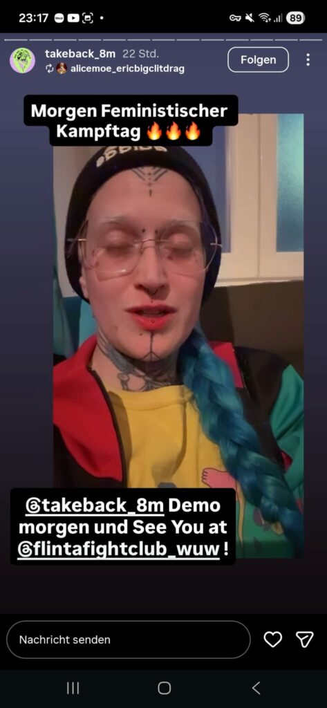 Im Amerlinghaus gibt es auch einen sogenannten „flintafightclub“ – diese Dame kündigte auf Instagram an, dem Patriarchat in die „Goschn hauen“ zu wollen.