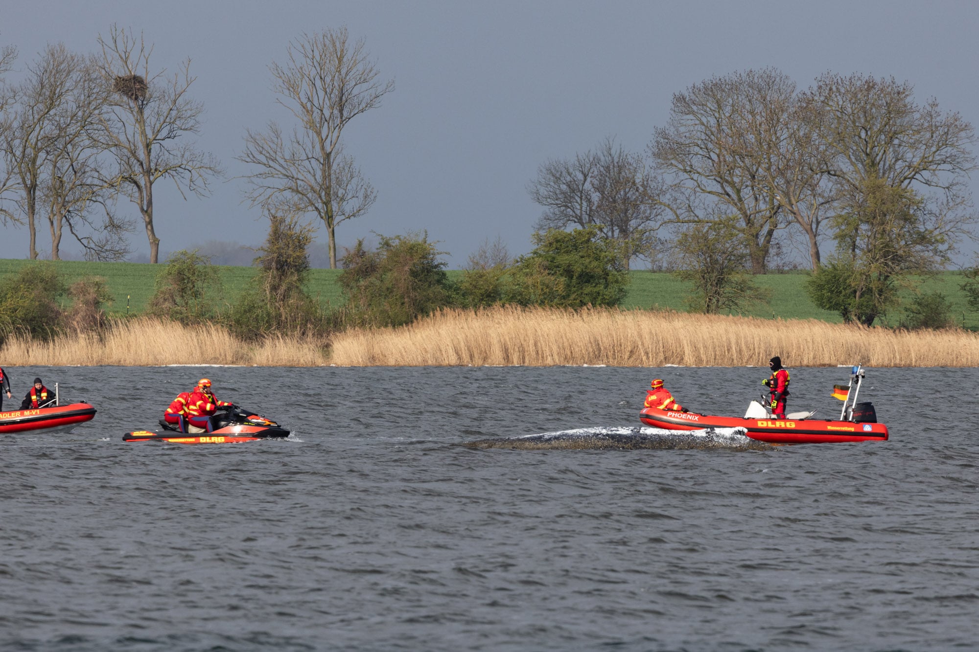 Die DLRG sichert die Helfer und Taucher bei der Walrettung ab.