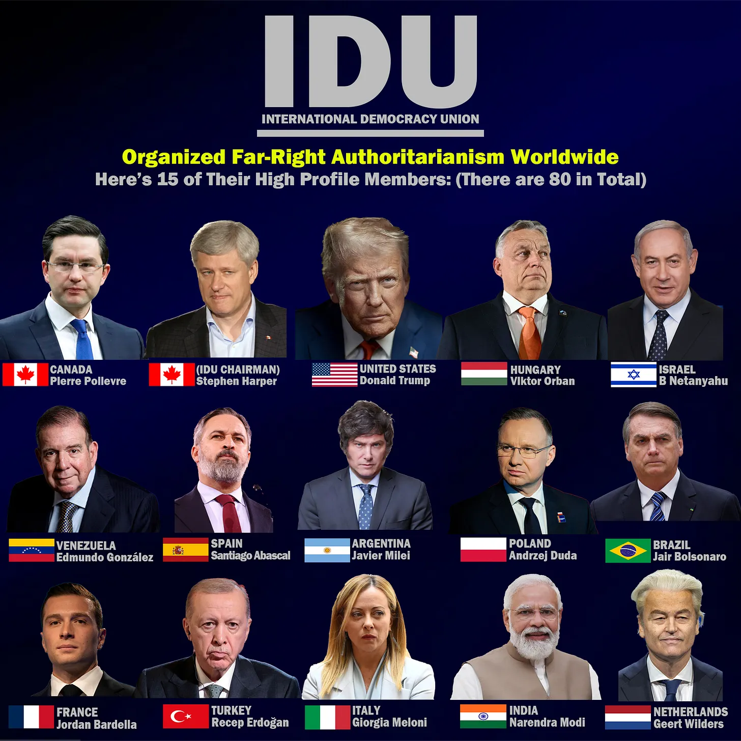 Der derzeitige Vorsitzende der IDU ist Stephen Harper, ehemaliger Premierminister von Kanada, der eine besondere und relevante Qualifikation für diese Rolle mitbringt: 2012 war Harper einer der ersten westlichen Staatschefs, der alle diplomatischen Beziehungen zum iranischen Regime abbrach, das er öffentlich als „böse“ und „revolutionäre Macht“ mit „globalen Ambitionen“ bezeichnete. Harper’s persönliche Überzeugung, dass das iranische Regime nicht reformiert, sondern nur bekämpft werden kann, ist nun der offizielle Konsens der IDU.