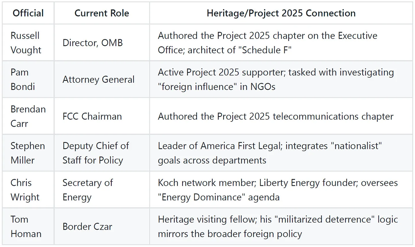 Bis Ende 2025 hatten etwa 70 % von Trumps Kabinett und mehr als 50 hochrangige Regierungsbeamte zuvor direkt bei der Heritage Foundation oder ihren Partnerorganisationen des Projekts 2025 gearbeitet. Diese Statistik erhält nicht die Aufmerksamkeit, die sie verdient. Wir sprechen hier nicht von einer vagen ideologischen Übereinstimmung. Wir sprechen von einer systematischen Platzierungsoperation, bei der Heritage loyale Personen identifizierte, überprüfte, ausbildete und in bestimmte Positionen brachte, die für die Umsetzung ihrer Agenda erforderlich waren – darunter vor allem Positionen, die die Energiepolitik, die Beschaffung von Verteidigungsgütern, die Durchsetzung von Sanktionen und die Nahost-Strategie kontrollieren.