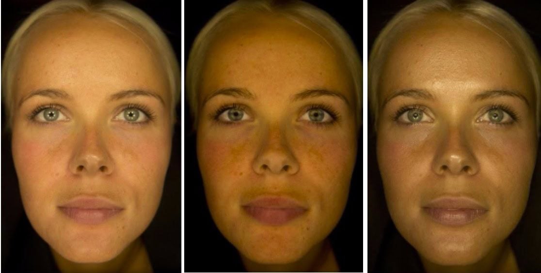 Triptychon eines Frauengesichts unter unterschiedlicher Beleuchtung, das gleichmäßigen Hautton, Verfärbungen und Oberflächenstruktur der Haut zeigt.