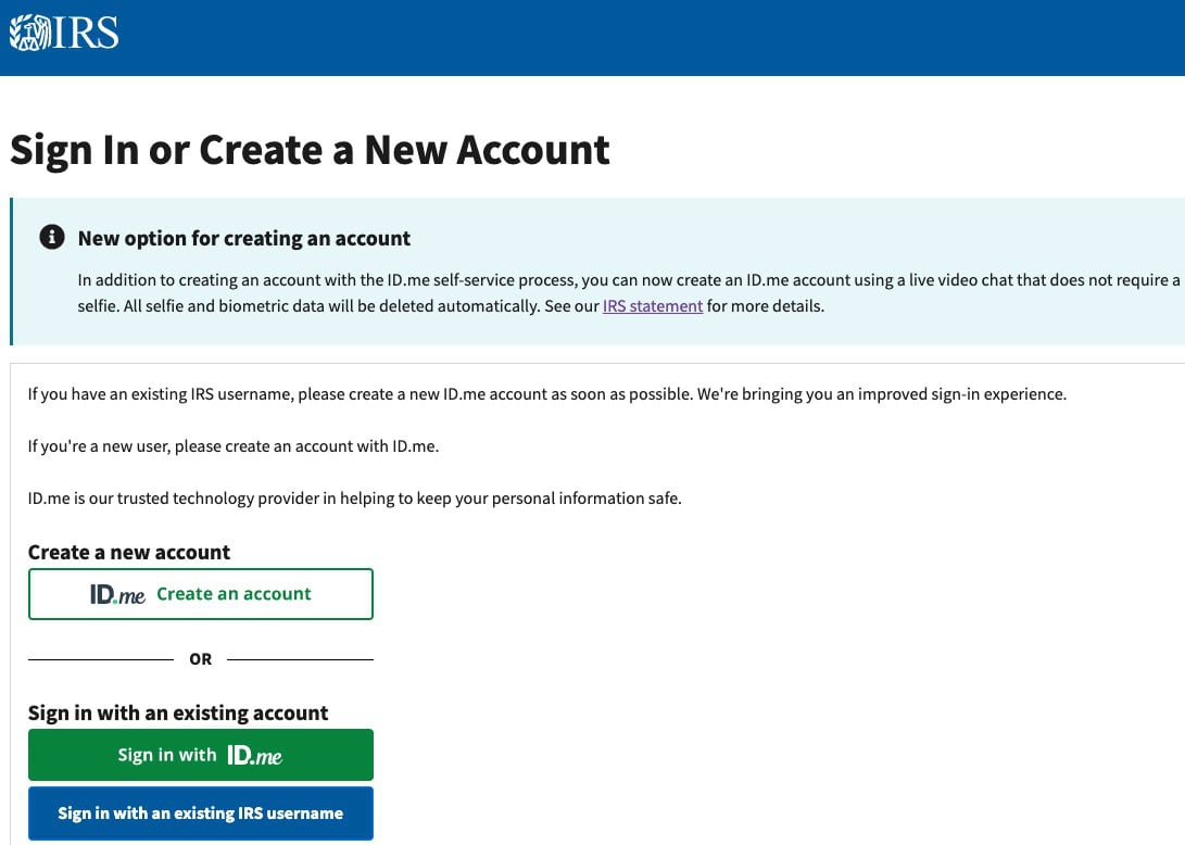 Anmeldeseite des IRS mit Optionen zur Erstellung eines ID.me-Kontos oder zur Anmeldung mit ID.me oder einem bestehenden IRS-Benutzernamen.