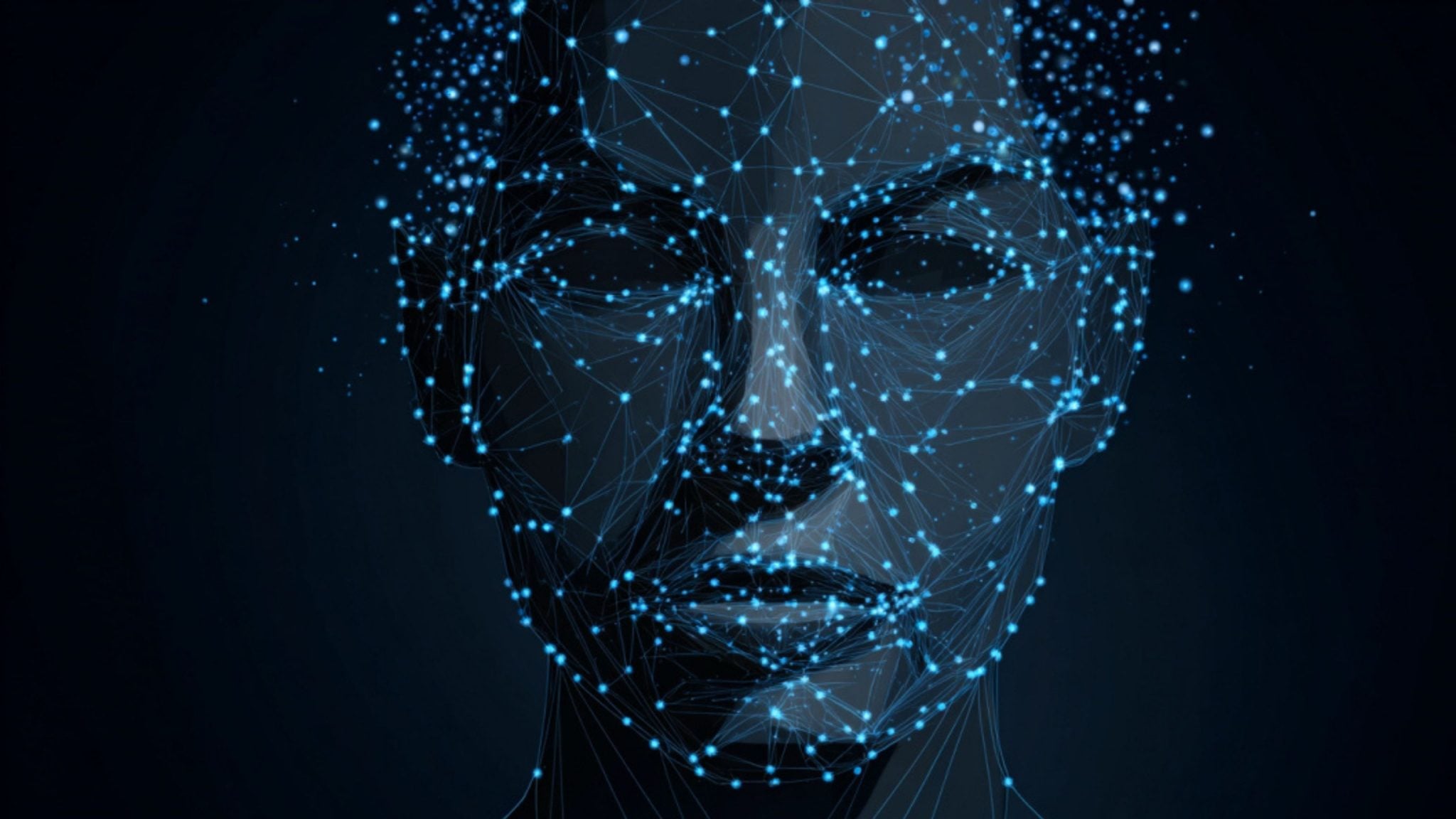 Abstraktes menschliches Gesicht, gebildet aus blau leuchtenden Netzwerkknoten und verbindenden Linien vor dunklem Hintergrund.