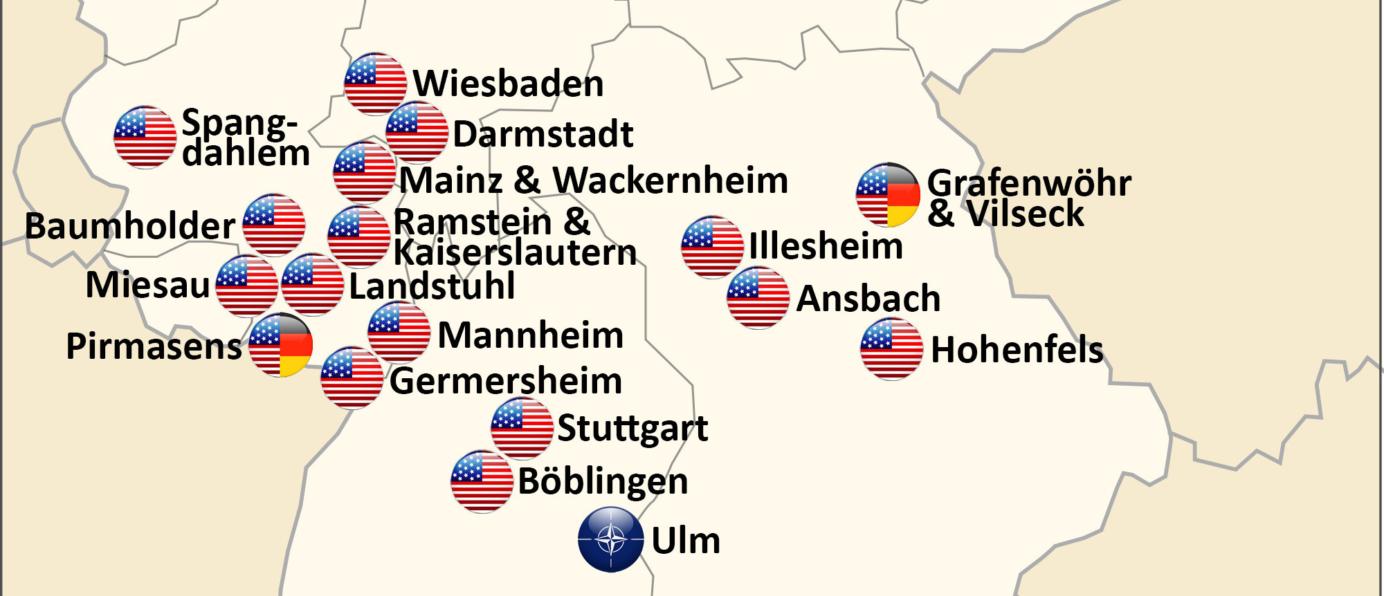 Die US-Armee unterhält über 40 Militärstützpunkte in Deutschland, von denen zwei geschlossen werden sollen. Über 220 weitere wurden bereits stillgelegt, die meisten nach dem Ende des Kalten Krieges in den 1990er Jahren. Viele waren strategisch günstig gelegen, um im Falle eines Krieges gegen die UdSSR als vorgeschobene Stützpunkte zu dienen.“