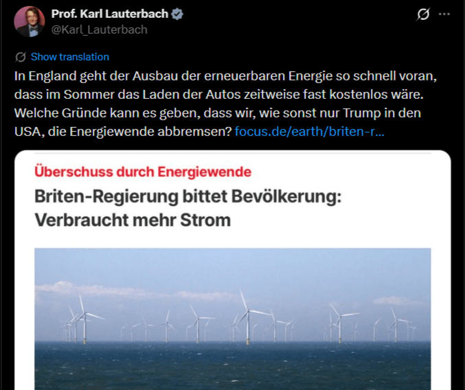 Nun ist die Plandemie vorbei und Leute wie Lauterbach müssen sich eine neue Spielwiese suchen, um sich als „informiert“ und damit anderen überlegen inszenieren zu können. Und so kommt es, dass der „Mediziner“ Lauterbach sich zum Experten in Sachen „erneuerbarer Energie“ erklärt hat.