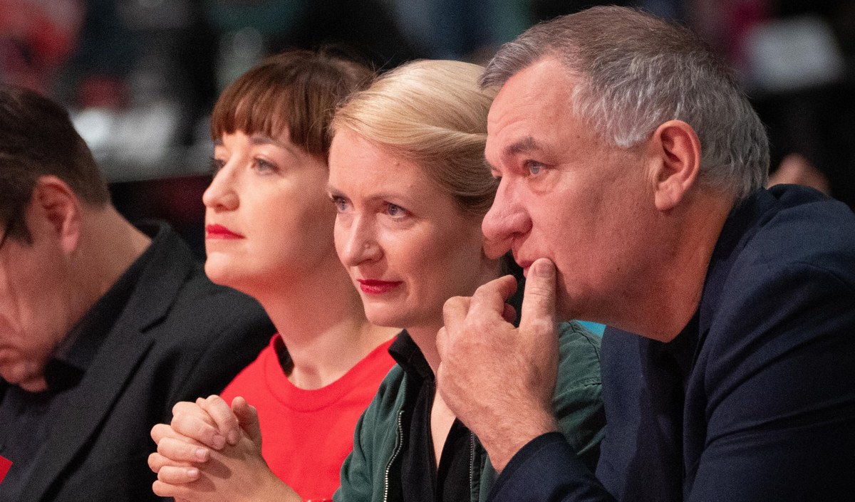 Zwei Landtagswahlen, zwei Rückschläge? Die Linken-Spitzen Jan van Aken, Ines Schwerdtner, Heidi Reichinnek, im Hintergrund Sören Pellmann
