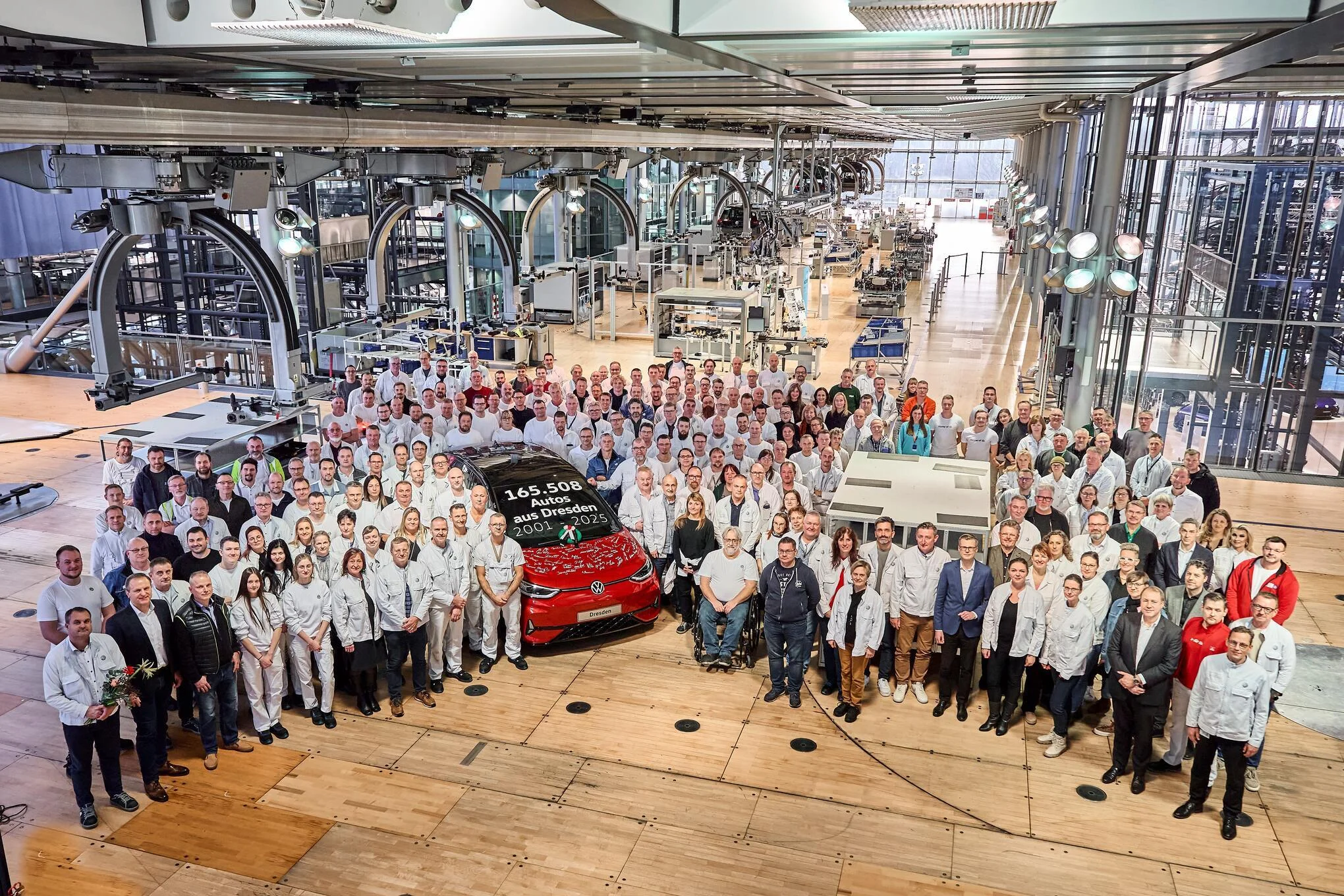 Viele Gesichter sind ernst auf dem Gruppenbild, das Volkswagen Sachsen am Dienstagnachmittag veröffentlicht hat. Mitarbeiterinnen und Mitarbeiter der „Gläsernen Manufaktur“ haben sich um einen knallroten VW ID.3 GTX versammelt. Es ist das letzte Auto, das sie an dem Standort mitten im Zentrum von Dresden gebaut haben.