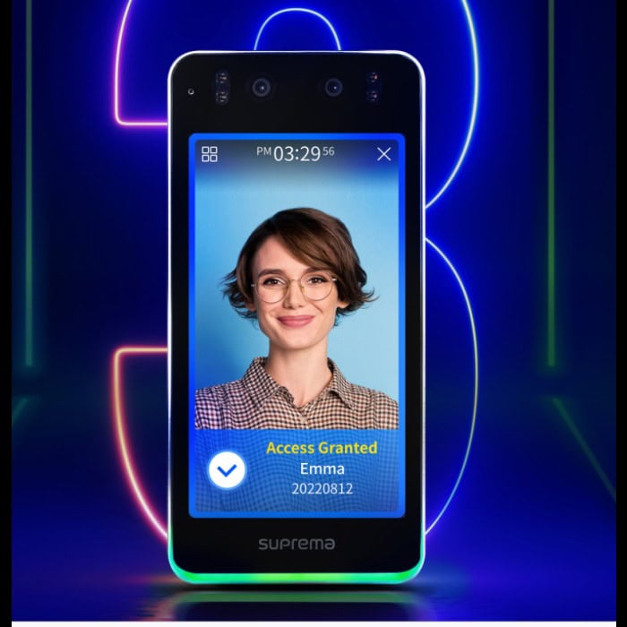 Biometrischer Touchscreen mit dem Porträt einer Frau, „Access Granted“ und dem Namen Emma, Suprema-Logo.