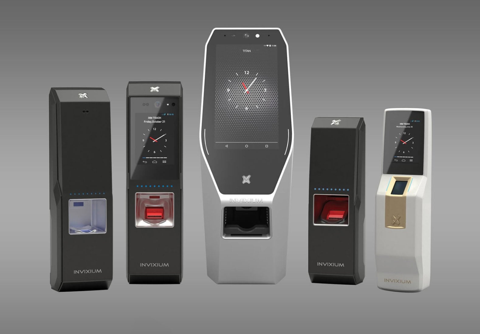 Reihe von fünf biometrischen Zugangsterminals von Invixium, schlanke schwarze und weiße Geräte mit Touchscreens und roten Fingerabdruckscannern.