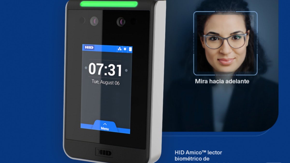 Gesichtserkennungs-Terminal von HID mit Touchscreen, der 07:31 anzeigt und das gerahmte Gesicht einer Frau mit der Bildunterschrift „Mira hacia adelante.“