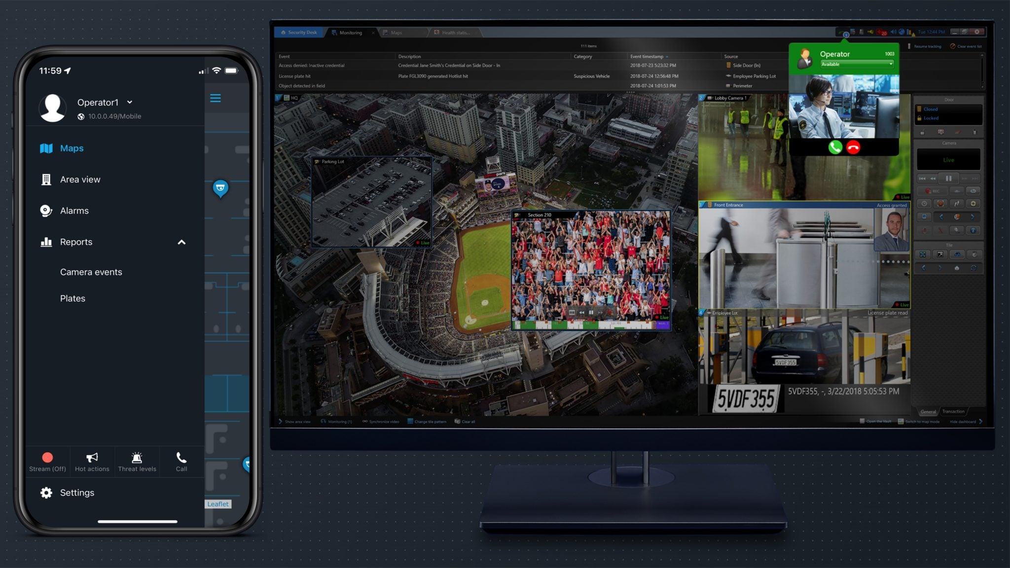 Telefon mit Sicherheits-App neben einem Monitor, der eine Luftaufnahme eines Stadions und CCTV-Feeds von Menschenmengen, Drehkreuzen und einem Nummernschild zeigt.