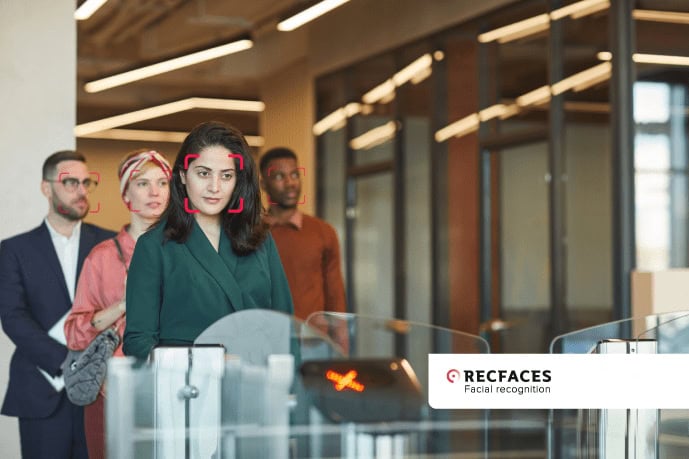 Frau in Grün an einem Büro-Drehkreuz mit drei Personen hinter ihr und roten Gesichtserkennungsrahmen über den Gesichtern; REC FACES-Beschriftung sichtbar.