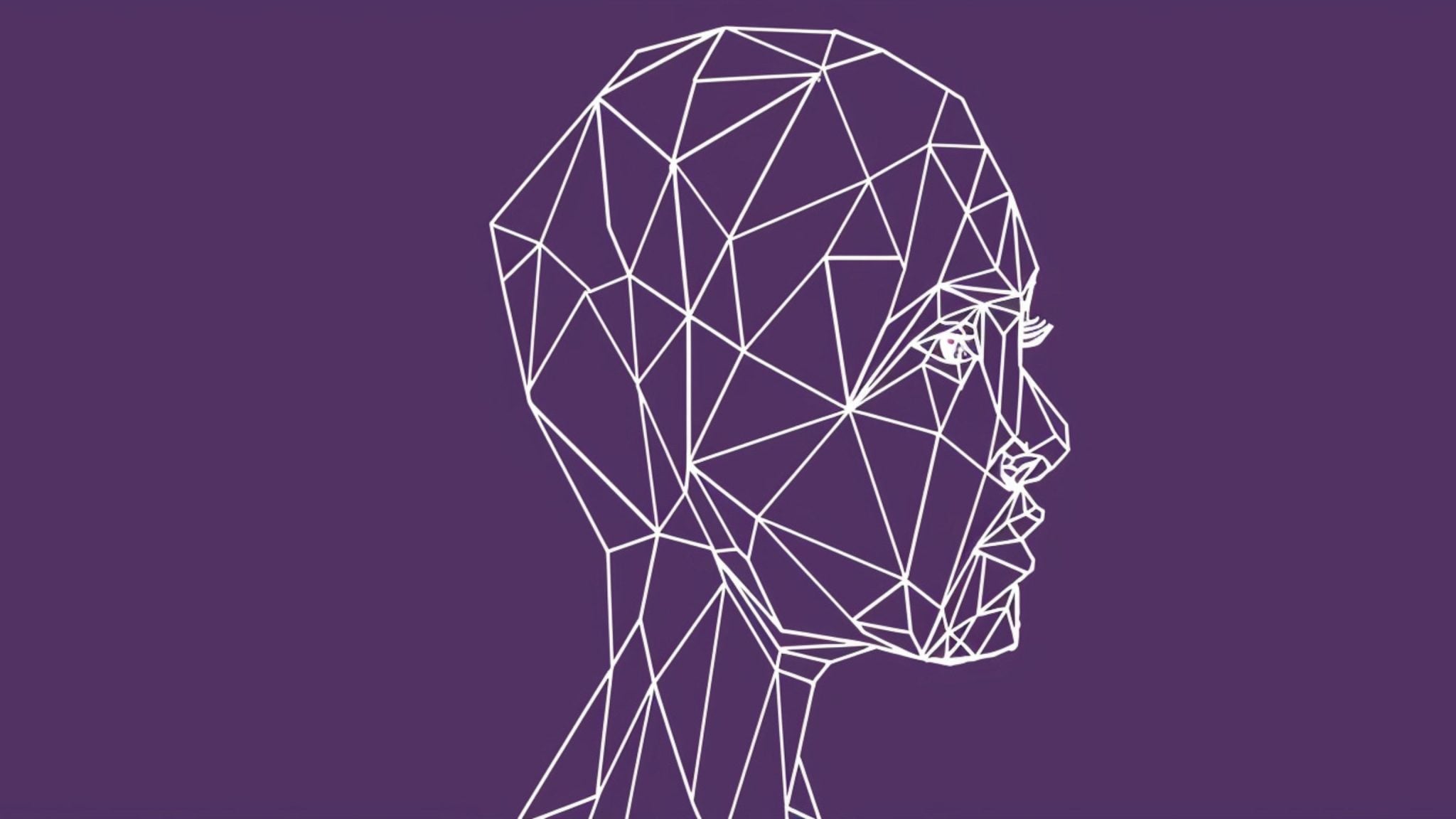 Weißer, drahtgitterartiger polygonaler menschlicher Kopf im Profil, aus verbundenen Dreiecken geformt, vor einfarbig violettem Hintergrund.
