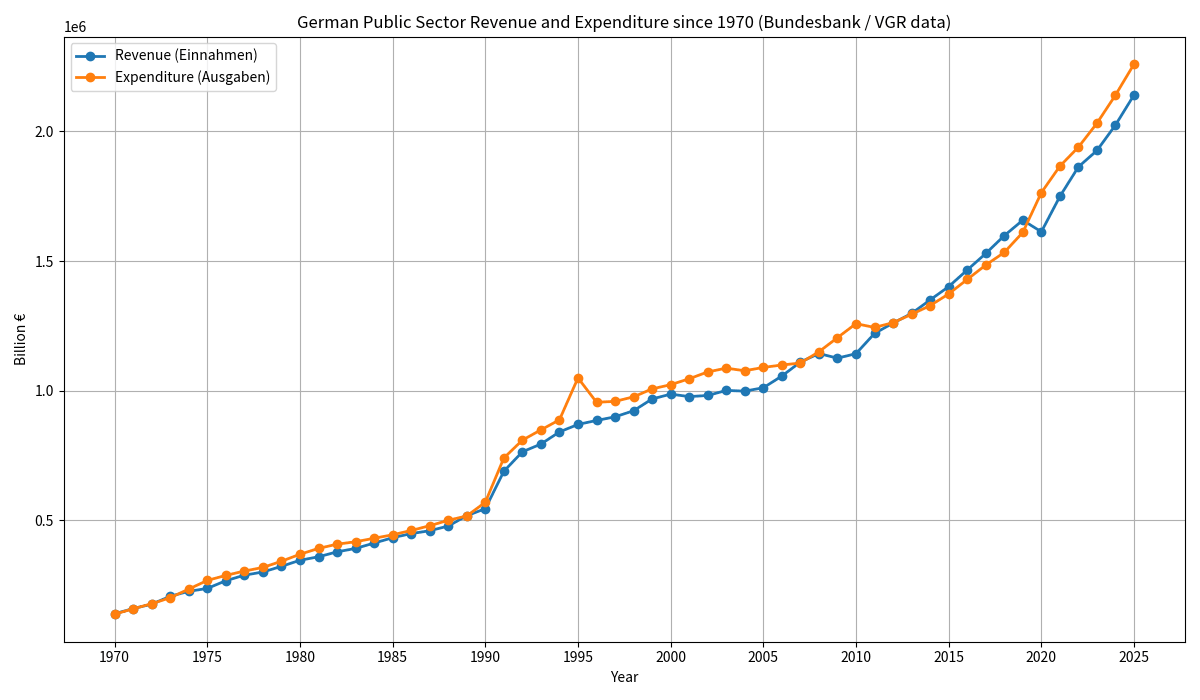 Betrachtet man nur den Zeitraum von 2000 bis 2025, dann sind in diesem Zeitraum die Einnahmen von 960,8 Milliarden Euro auf 2.251,3 Milliarden Euro gestiegen. Ein Plus von 119%. Im selben Zeitruam sind die Staatsausgaben von 979,3 Milliarden Euro auf 2.140,2 Milliarden Euro angewachsen. Ein Plus von 135%