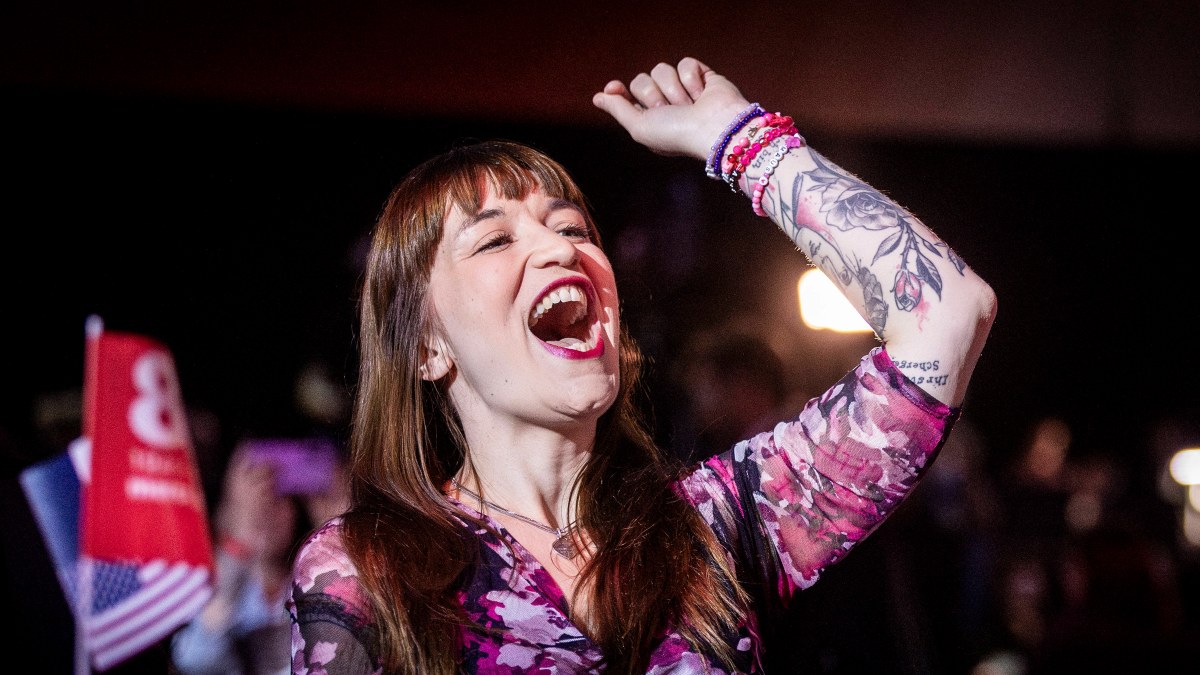 Heidi Reichinnek, Die Linke, jubelnd während des neunten Parteitages in Chemnitz, 09.05.2025
