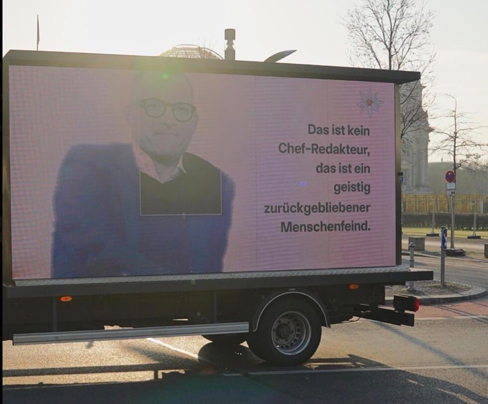 „Das ist kein Chefredakteur, das ist ein geistig zurückgebliebener Menschenfeind“ steht neben dem Reichelt-Porträt auf dem Lastwagen. „Das Kranke und Böse steht dem Ex-Bild-Chefredakteur schon ins Gesicht geschrieben“, raunen die Aktivisten in ihren Clips.