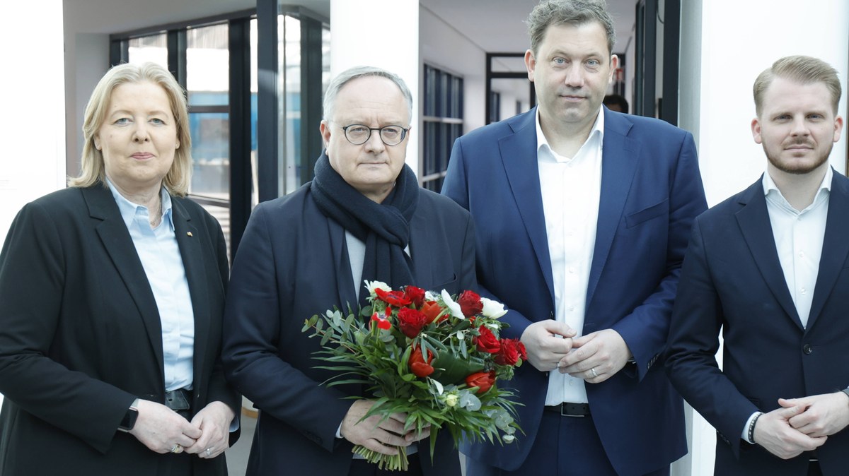 Glückwunsch! Die Parteispitze aus Bärbel Bas und Lars Klingbeil sowie Generalsekretär Tim Klüssendorf gratuliert im Willy-Brandt-Haus dem Spitzenkandidaten der SPD Baden-Württemberg, Andreas Stoch (mit Blumen).