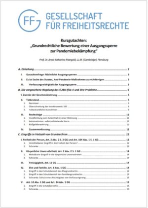[2] Kurzgutachten: Grundrechtliche Bewertung einer Ausgangssperre zur Pandemiebekämpfung“ , Prof. Dr. Anna Katharina Mangold, LL.M. (Cambridge) Flensburg im Auftrag der Gesellschaft für Freiheitsrechte (GFF)