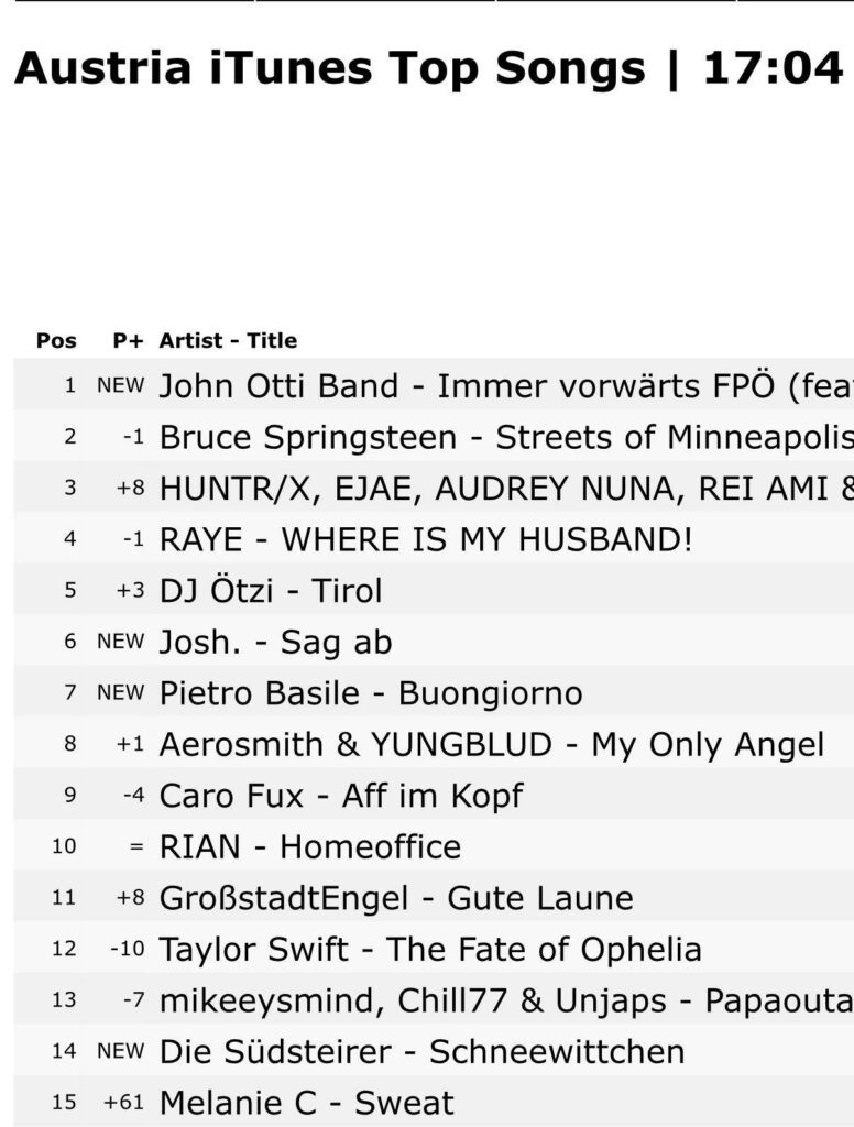 Der neue Song der Freiheitlichen, „Immer vorwärts, FPÖ“ feiert einen sensationellen Chart-Erfolg. In den Austria iTunes Top Songs belegt das Lied der John Otti Band den ersten Platz – noch vor Weltstar Bruce Springsteen mit seiner Protest-Hymne „Streets of Minneapolis“.