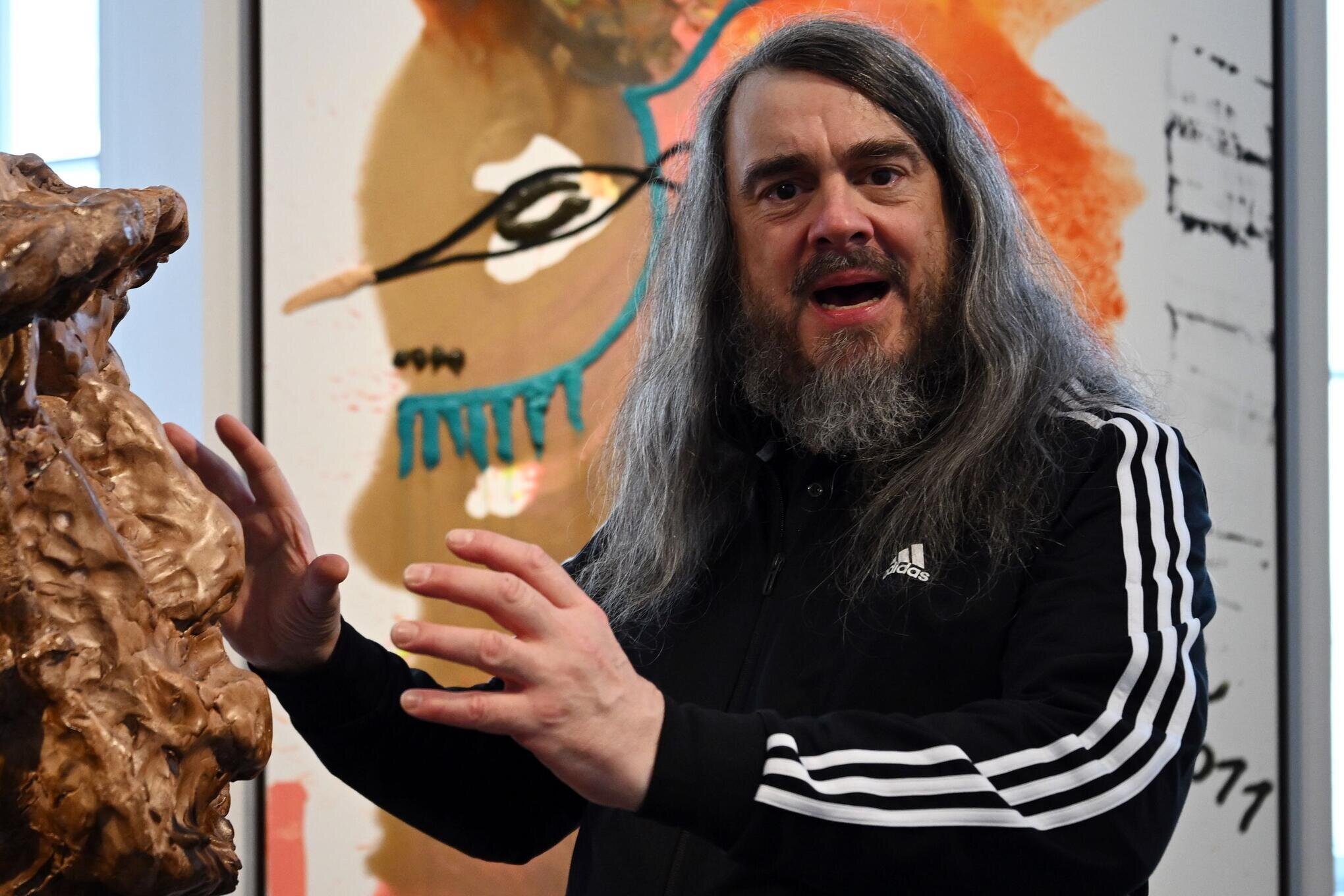 Gleich wird er loslegen. Doch fürs Erste öffnet Jonathan Meese dem Gast persönlich die Tür zu seiner Ausstellung: ein zugewandter und höflicher Mann mit weichen braunen Augen – einer von der seltenen Sorte, die sich direkt nahbar anfühlen.