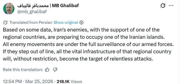 Der Parlamentspräsident, der derzeit zunehmend als de facto regierender Kraft des Landes angesehen wird, hat gewarnt: „Die gesamte lebenswichtige Infrastruktur jenes Landes in der Region [das Unterstützung leistet] wird ohne Einschränkung zum Ziel unerbittlicher Angriffe werden.“ Das WSJ hat einen recht interessanten und unerwarteten neuen Bericht über Mohammad-Bagher Ghalibaf veröffentlicht:
