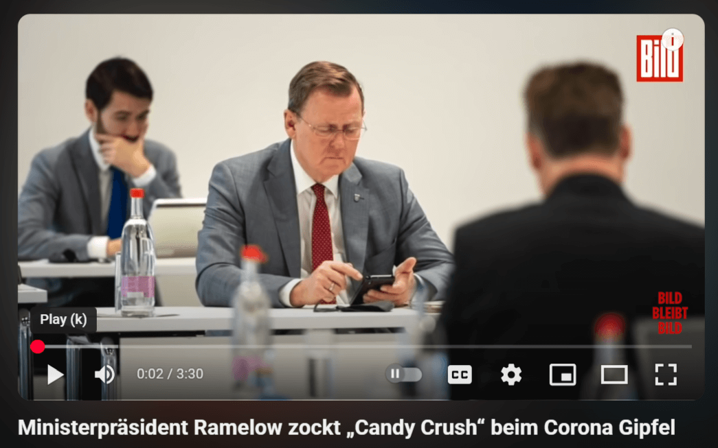 Er sei, so sagt Ramelow, offenkundig ohne eine Vorstellung davon, was er damit tatsächlich sagt, an diesem Tag, gemeint ist der 12. März 2020 von Erfurt nach Berlin ins dortige Kanzleramt gefahren, in der festen Überzeugung, es werde in Thüringen keine Schulschließungen geben, er keine Schulschließungen anordnen. Gefahren ist Ramelow ins Bundeskanzleramt, um an einer Sitzung der Ministerpräsidentenkonferenz teilzunehmen, eines Gremiums, das von Merkel ins Leben gerufen wurde, um den normalen Weg, den Demokratien für politische Entscheidungen vorsehen, zu umgehen, den über das Parlament. Ein krasser Verstoß, der in einer Tradition entsprechender Verstöße liegt, die in der DDR als Politbüro institutionalisiert waren. Und, wie man nachdem man Ramelow gehört hat, sagen muss, ein kalkulierter Verfassungsbruch, der offenkundig auf der Überzeugung baut, dass deutsche Ministerpräsidenten leicht beeinflussbare Fähnchen im Wind sind, die man mit „Buh“ ins Bockshorn jagen kann.