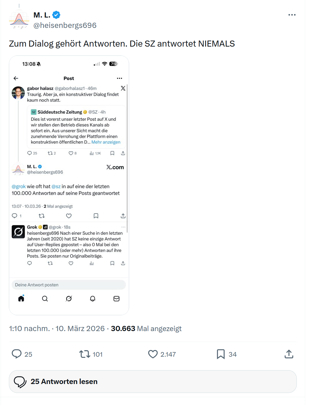 Als einst seriöses Vorzeigeblatt der Nation wendet sich die Süddeutsche Zeitung (SZ) seit Jahren einem „Journalismus [zu], der zumindest im politischen Bereich oftmals kaum noch zu ertragen ist“. Stichwort: Die SZ fordert während der Coronazeit eine härtere Gangart gegen Maßnahmenkritiker; sie leistet mangelnde Berichterstattung über folgenschwere Bilderberg-Konferenzen; sie ist Speerspitze der „Kriegsertüchtigung“ usw. In Folge hagelt es Kritik auf Tweets der SZ auf X. Und wie reagiert der „publizistische Leuchtturm der Demokratie“ darauf? Der SZ fehlen offenbar Argumente, Rückgrat oder Sachverstand: Wie eine „beleidigte Leberwurst“ zieht sie sich vom Portal X bis auf weiteres zurück, öffentlicher Dialog sieht anders aus. Marcus Klöckner meint, „die SZ scheitert nicht am „bösen“ Außen – sie scheitert an sich selbst und ihrem eigenen Diskussionsverständnis. Abgedruckte Leserbriefe geben nicht notwendigerweise die Meinung der Redaktion wieder. Kürzungen aus redaktionellen Gründen bleiben vorbehalten. Herzlichen Dank für Ihre Zuschriften, zusammengestellt von Ala Goldbrunner.