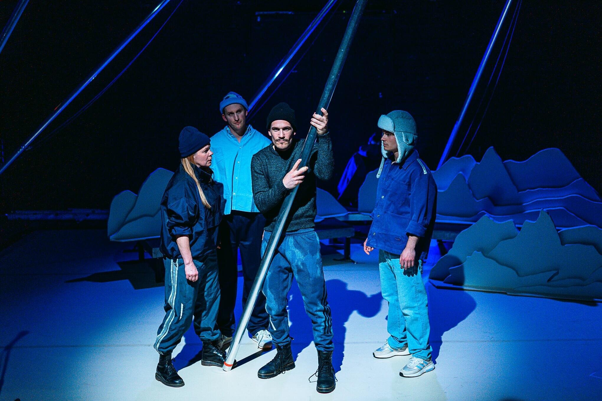 Vier Rücken. Kein Blick, kein Gesicht, nur Richtung: Meer. Wellenrauschen, Klicklaute – ein akustischer Ozean, der den Raum besetzt. Aus dem Off eine auf wenige Sätze reduzierte Jona-Predigt. Religion als Restgröße. Dann Licht. Ismael (Peter Peniaška), Queequeg (Milon Goetz), Starbuck (Juschka Spitzer) und Stubb (Fabian Vogt) heben an und…