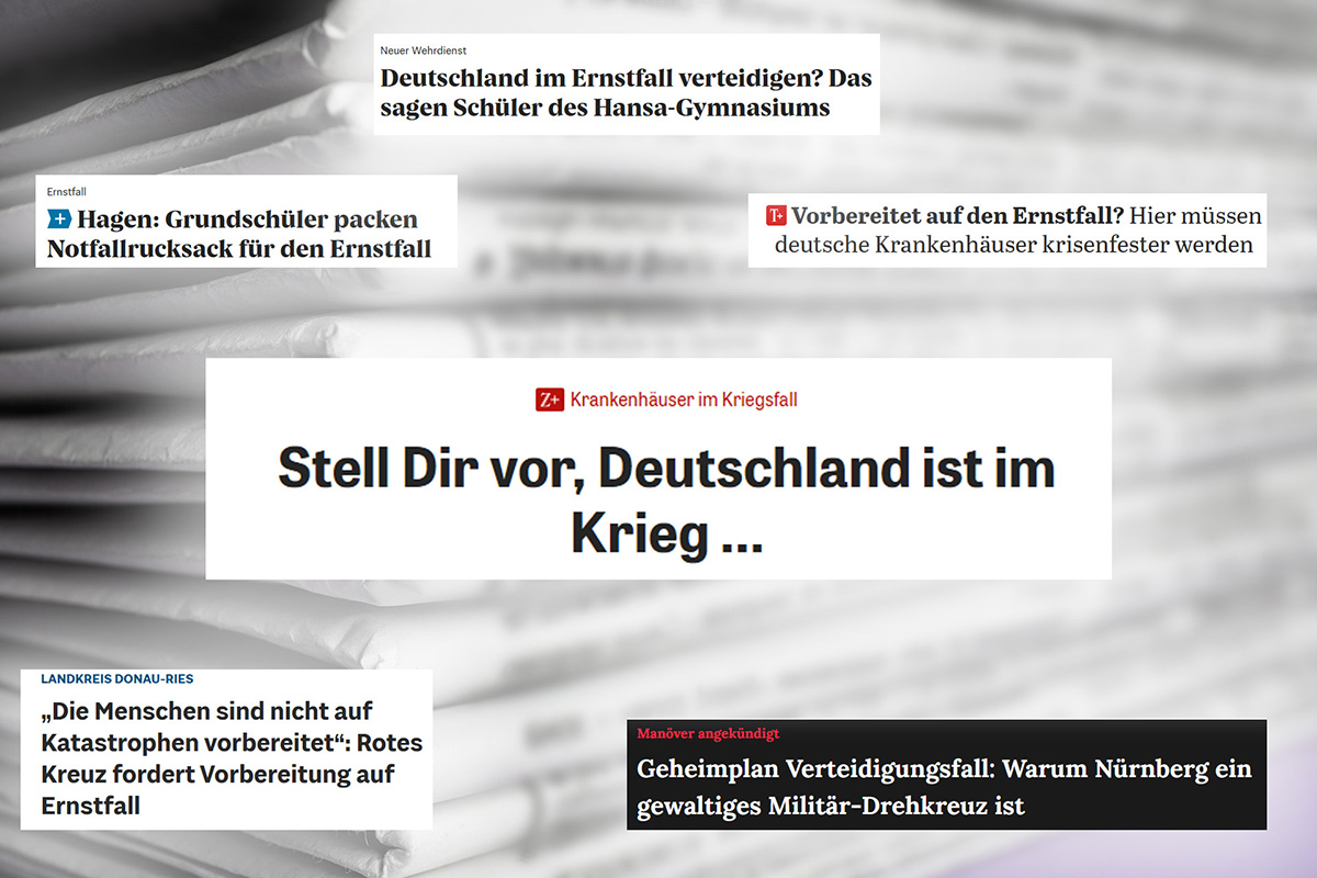 Notfall, Ernstfall, Verteidigungsfall, Kriegsfall: Die deutschen Medien sind noch immer voller Nachrichten, die vom „Fall des Falles“ berichten. Eine einfache Suche auf Google News lässt erahnen, was im Land passiert. Die Politik bestimmt den Ton, alle untergeordneten Stellen folgen. Gerade berichten die Nürnberger Nachrichten von dem „Geheimplan Deutschland“ und „Warum Nürnberg ein gewaltiges Militär-Drehkreuz ist“. Das Portal Ruhr24 schreibt: „Krieg in Europa: Essen verteilt Broschüre an 235.000 Haushalte“ und im Tagesspiegel heißt es: „Vorbereitet auf den Ernstfall?: Hier müssen deutsche Krankenhäuser krisenfester werden“. So „berichten“ Medien – vor und zurück. Sie vergessen dabei, eine zentrale Frage auf eine kritische Weise zu stellen: Was soll das? Ein Kommentar von Marcus Klöckner.