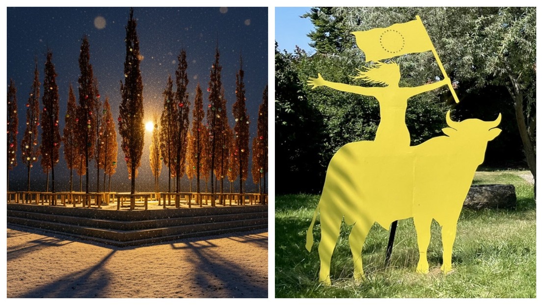 Was wäre ein Tempel ohne eine entsprechende Götterstatue? Zu einer Monumentalplastik in Marmor oder Bronze reicht es noch nicht, aber neben der „Glyptothek“ soll in Zukunft auf dem „Alten Berg“ in Etsdorf eine Silhouette aus Stahl namens „Glückliches Europa“ als „europäische Landmarke der Völkerverständigung“ aufgestellt werden. Die 10 Meter hohe Landmarke, eine jubelnde, die Europa-Fahne schwenkende Europa auf dem Stier, wird gelb angemalt sein und „als völkerverbindendes, transnationales Symbol für die Bürger Europas“ über die in Sichtweite verlaufende Europastraße E50 wachen, die vom Atlantik bis zum Kaspischen Meer verläuft. Zusammen mit dem Blau des Himmels, der durch die ausgeschnittenen Europa-Sterne scheinen soll, ergibt sich somit ein Gesamteindruck einer Symphonie von Blau und Gelb. Zugleich ein Herrschaftsanspruch über all die Lande, die die E50 verbindet? Beim grassierenden Größenwahn der EU und ihrer Anhänger ist alles möglich. Aus christlicher Sicht fühlt man sich in unangenehmer Weise an das goldene Kalb erinnert. Oder auch an alteuropäische Stierkulte.