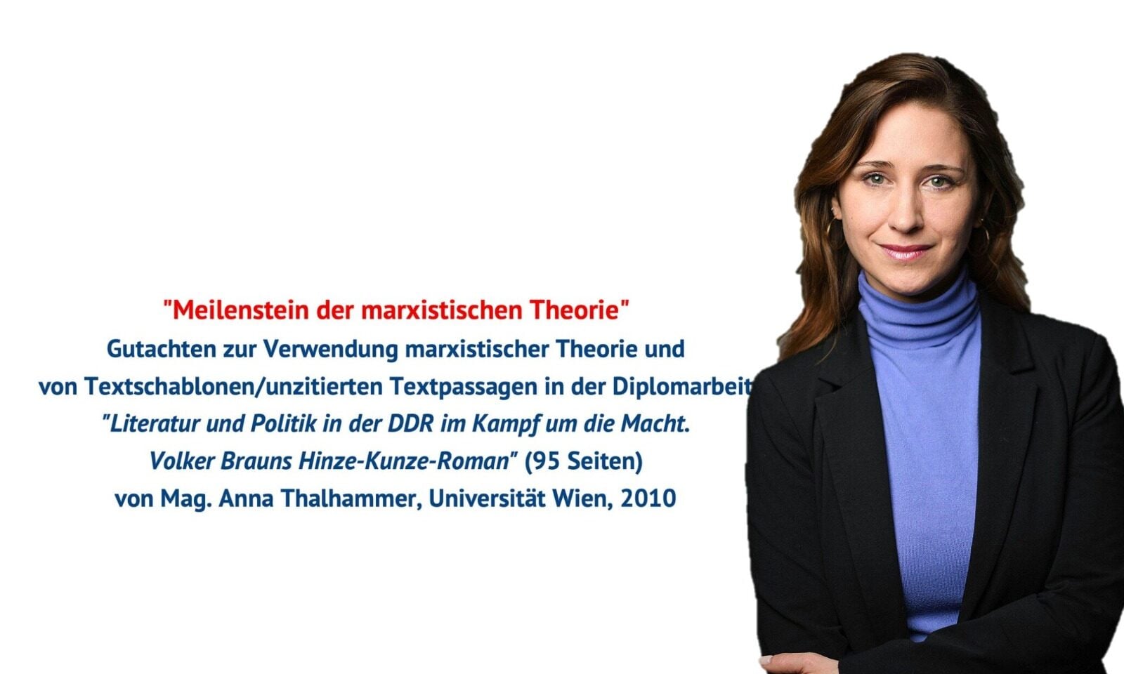 Thalhammer schrieb ihre 95 Seiten starke Diplomarbeit 2010 an der Universität Wien. Der Titel: „Literatur und Politik in der DDR im Kampf um Macht. Volker Brauns Hinze-Kunze-Roman“. Der bekannte Plagiatsprüfer Dozent Dr. Stefan Weber machte einen Blick darauf – mit einem vernichtenden Gutachten, das unzensuriert vorliegt.