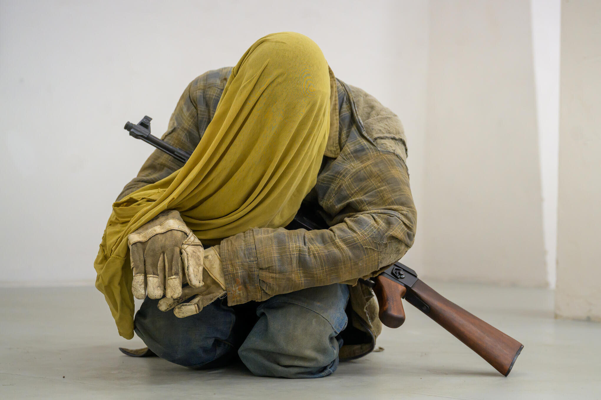 In einer Fußgängerzone würde diese kniende Figur für Irritationen sorgen, beim zweiten Blick für einen Aufschrei. Die Figur in schmutzigen Klamotten, den Kopf nach unten gesenkt, wirkt echt und hat eine Maschinenpistole im Arm. Aber von dieser Figur geht keine Gefahr aus. Sie ist müde, erschöpft vom Wahnsinn dieser Welt, und könnte deshalb…