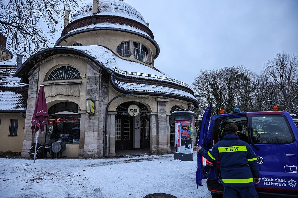 Freiwillige des Technischen Hilfswerks in der Nähe des S-Bahnhofs Mexikoplatz während des Stromausfalls nach einem Brandanschlag auf Stromkabel am 4. Januar 2026 in Berlin.