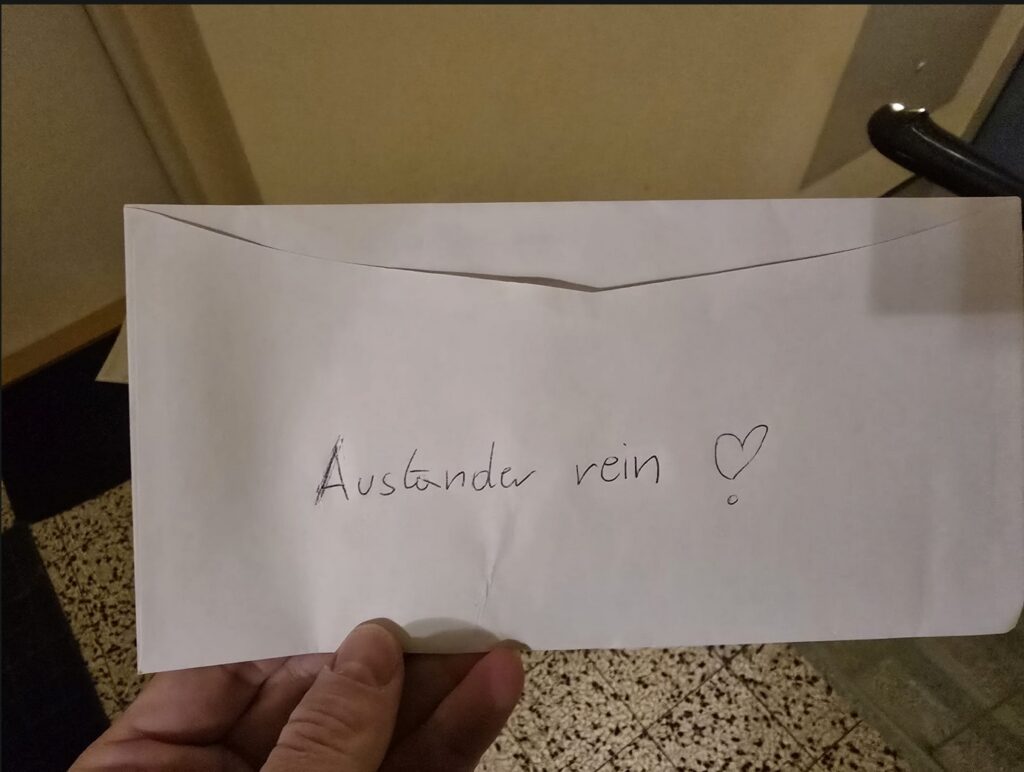 Auf der Rückseite des Kuverts stand – handschriftlich geschrieben – der Satz: „Ausländer rein!“. Herr L. sagte gegenüber unzensuriert: