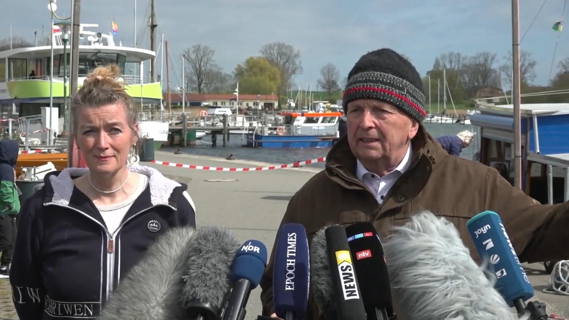 In der Bucht vor Pohl sind Polizeiboote zu sehen, die die Lage absichern. Derzeit wird der Einsatzplan vor Ort besprochen. Umweltminister Backhaus trat vor die Presse. Das Team der Bergungstaucher ist auch eingetroffen.