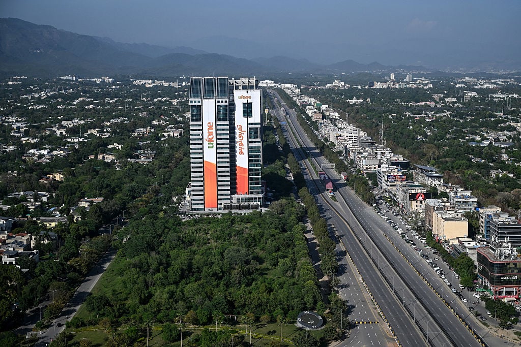 Am 20. April 2026 in Islamabad. Auf der Plakatwand ist auch Pakistans Premier Shehbaz Sharif (m) sowie der Armeechef und Feldmarschall Syed Asim Munir (l) zu sehen.