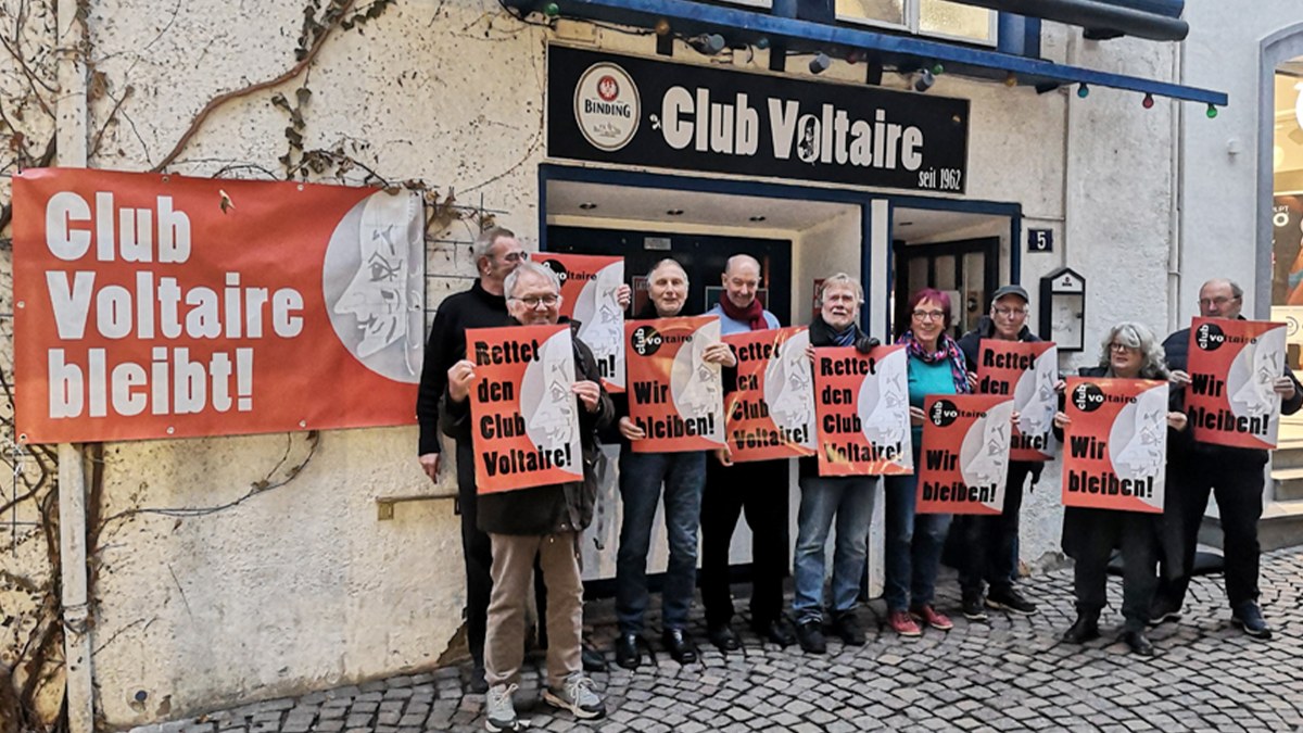 Der Mietvertrag des Club Voltaire mit den privaten Eigentümern des Hauses gilt noch bis Ende des Jahres, dann soll das Gebäude verkauft werden. Die Folgen wären der Abriss und ein Neubau, in dem „der Club“ sicher keinen Platz mehr hätte. Jetzt wird in der Stadt gesammelt und für den Erhalt getrommelt. Die Stadtpolitik, die einen Kauf beschließen könnte, ist angesprochen, die Stadtgesellschaft, die mit Krediten helfen könnte, ebenso. Wenn der Erhalt gelänge, würde sich sicher kein Banker aus dem Fenster stürzen. Aber ein gallisches Dorf der Veränderung wäre am Leben.