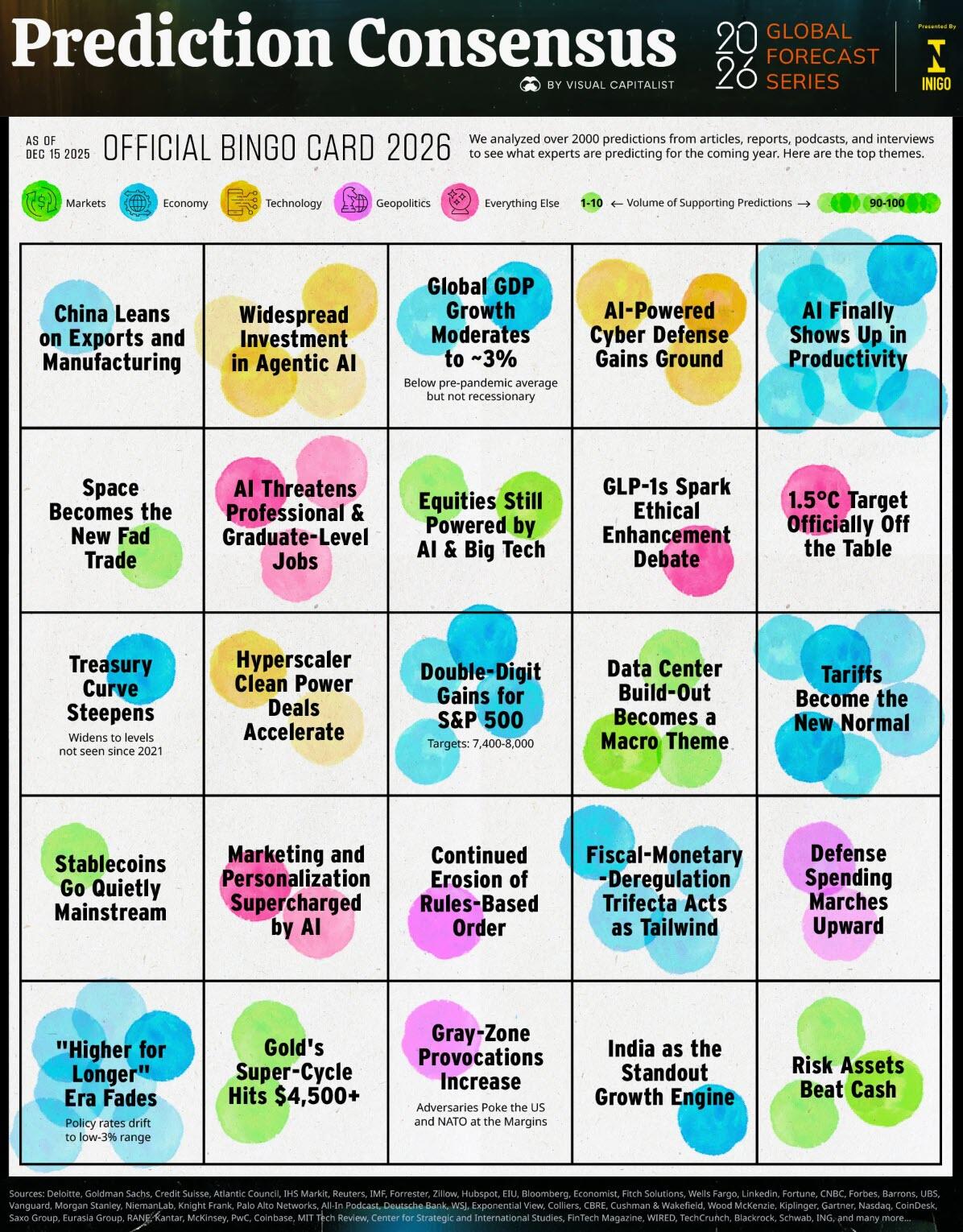 Zum siebten Mal in Folge hat Visual Capitalistdie Prognosen gesichtet, um Ihnen den „Prediction Consensus” zu präsentieren, eine Zusammenfassung der Erwartungen von Analysten, Vordenkern und Branchenexperten für das kommende Jahr.