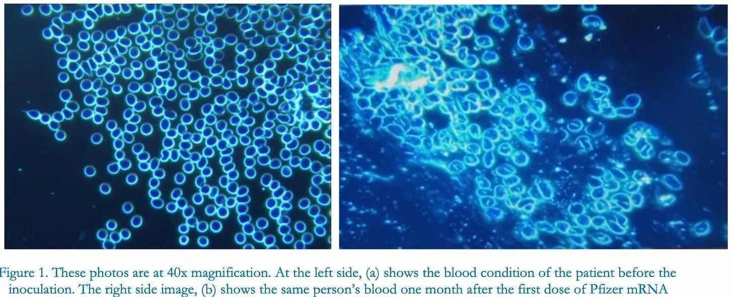 Kniselys Bewertungsskala für den Schweregrad der Blutverstopfung stand in direktem Zusammenhang mit der Krankheitsprognose. Dieselbe Verstopfung ist in dem folgenden Video zu sehen, das aus den Augen eines durch den COVID-19-Impfstoff geschädigten Patienten aufgenommen wurde.