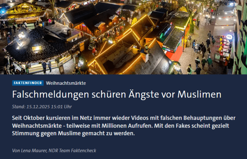 „Viele Beiträge suggerieren, dass Menschen, die als Muslime gesehen werden, sich respektlos gegenüber der christlichen Tradition verhalten würden. In mehreren Videos, die seit dem zweiten Advent kursieren, sind Demonstrierende mit syrischen Flaggen [es sind palästinensische Flaggen] in den Händen zu sehen. Im Hintergrund sind Weihnachtsbäume oder Weihnachtsmarkthütten erkennbar. So zum Beispiel in Videos aus Berlin oder Mainz, die millionenfach aufgerufen wurden.