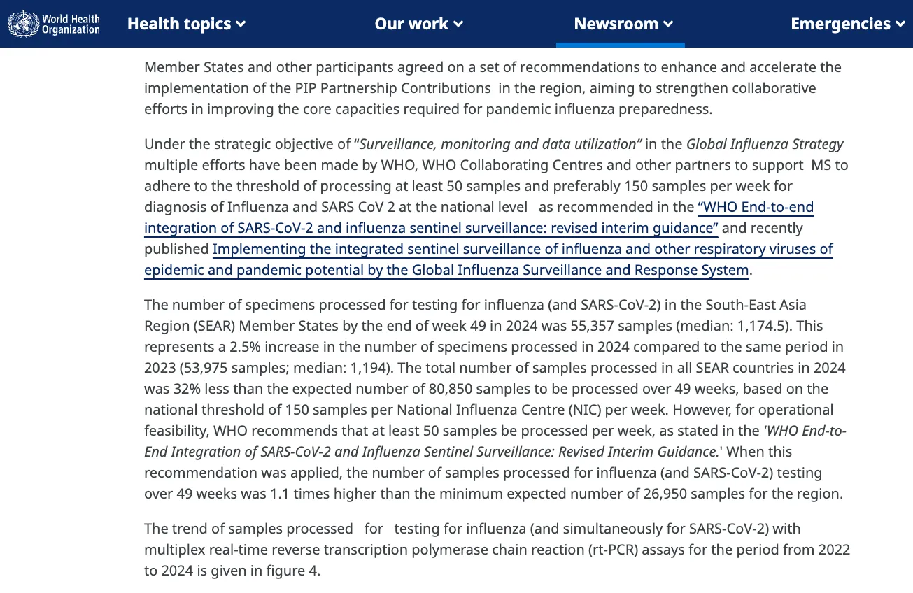 - Im Rahmen des strategischen Ziels „Überwachung, Monitoring und Datennutzung“ der Globalen Influenza-Strategie wurden durch die WHO, die WHO-Kooperationszentren und andere Partner mehrere Maßnahmen ergriffen, um die Mitgliedstaaten dabei zu unterstützen, den Schwellenwert der Verarbeitung von mindestens 50 Proben und vorzugsweise 150 Proben pro Woche für die Diagnose von Influenza und SARS-CoV-2 auf nationaler Ebene einzuhalten, wie in der „WHO-End-to-End-Integration der Sentinel-Überwachung von SARS-CoV-2 und Influenza: überarbeitete vorläufige Leitlinien“ empfohlen und kürzlich in Implementing the integrated sentinel surveillance of influenza and other respiratory viruses of epidemic and pandemic potential by the Global Influenza Surveillance and Response System veröffentlicht.