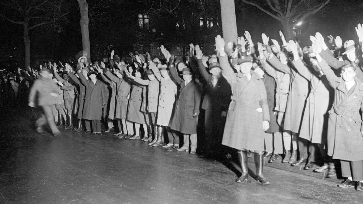 Am 9. Dezember 1930 grüßen Demonstranten gegen den Antikriegsfilm „Im Westen nichts Neues “Joseph Goebbels, der auf dem Weg zu einer Rede auf dem Berliner Wittenbergplatz ist