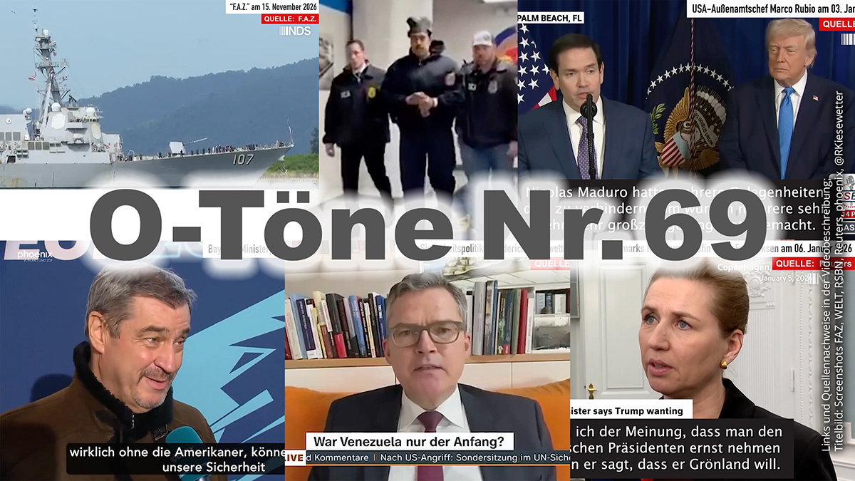 Langsam erreicht die Europäer die Erkenntnis, dass sie sich in Sachen Sicherheit, aber auch in Bezug auf die demokratischen Werte nicht mehr auf die USA verlassen können – jedenfalls so lange, wie US-Präsident Donald Trump in den Vereinigten Staaten das Regiment führt. Nach der Entführung des venezolanischen Präsidenten Nicolás Maduro erhebt Trump nun den Anspruch auf die dänische Insel Grönland, womit die gesamte Sicherheitsarchitektur Europas auf den Kopf gestellt wird. Das neue Schlagwort des politischen Vokabulars lautet „Epochenbruch“. Eine neue Ausgabe der O-Töne. Von Valeri Schiller.